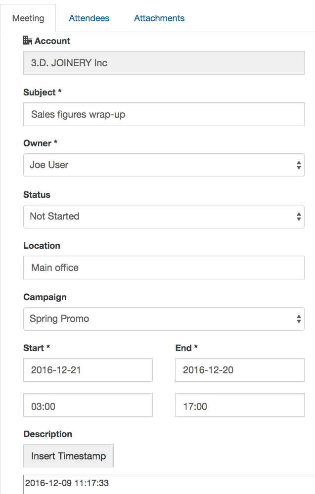 Status: In this example, the status is left blank. This field must be manually populated. It will not automatically switch to Completed when the meeting is finished. The options in the Status list can be edited by administrators using the CRM Picklists feature.