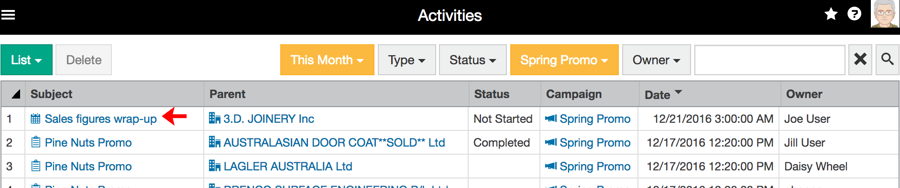 Use the Owner filter to display only your activities or activities that belong to another user (that you have permissions to view).