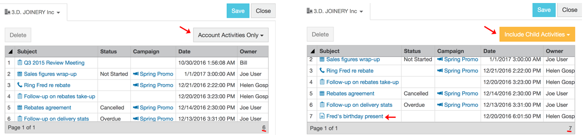 Use the Parent filter to specify the account, contact, or lead, to which the activity relates.