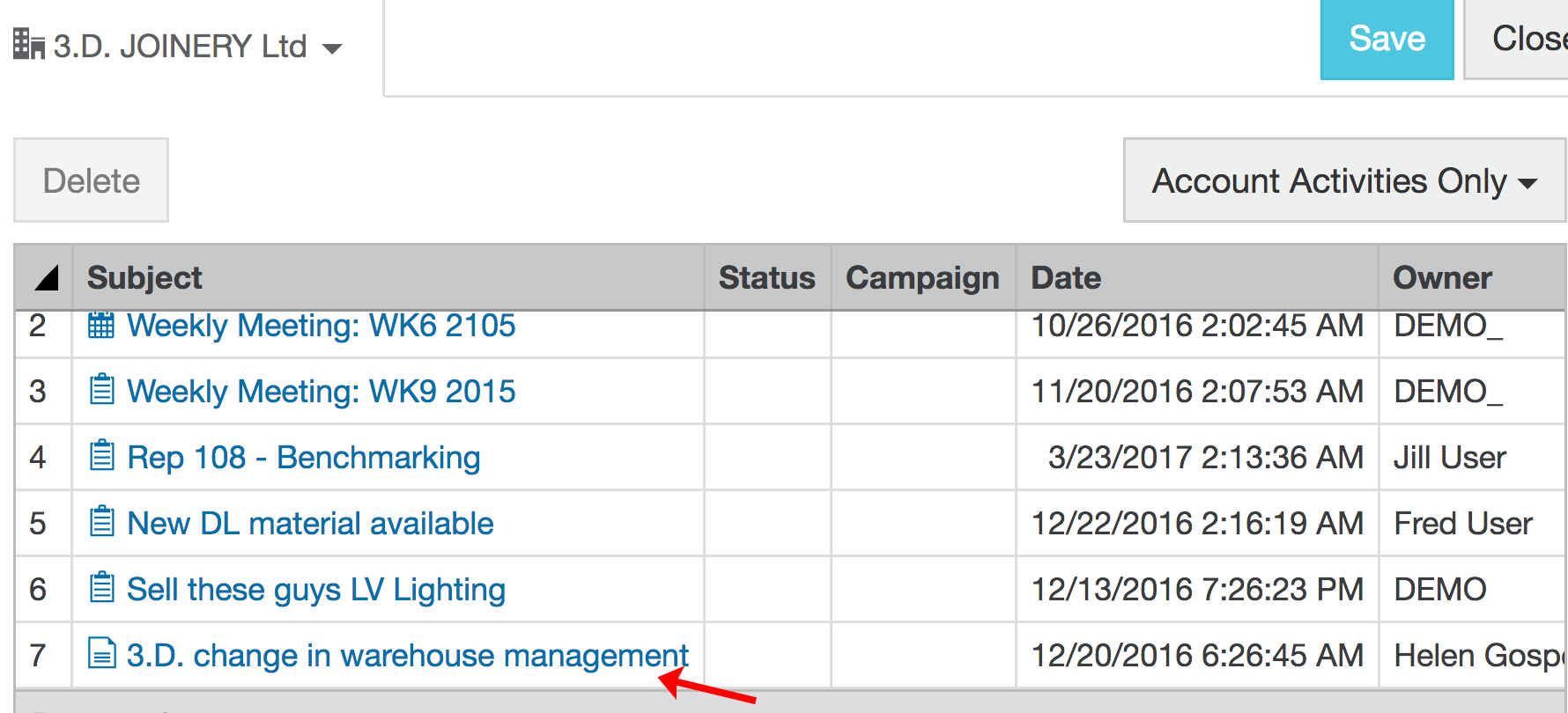 Suppose a customer calls you to inquire about a promotional offer you contacted them about last month. The phone call came from Fred at 3.D. Joinery Inc. You want to record this call against their account.