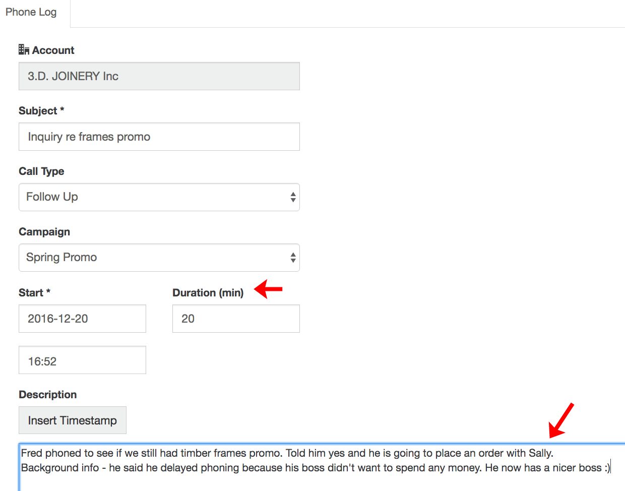 Enter the call details (such as duration and description of what was discussed) and click Save.