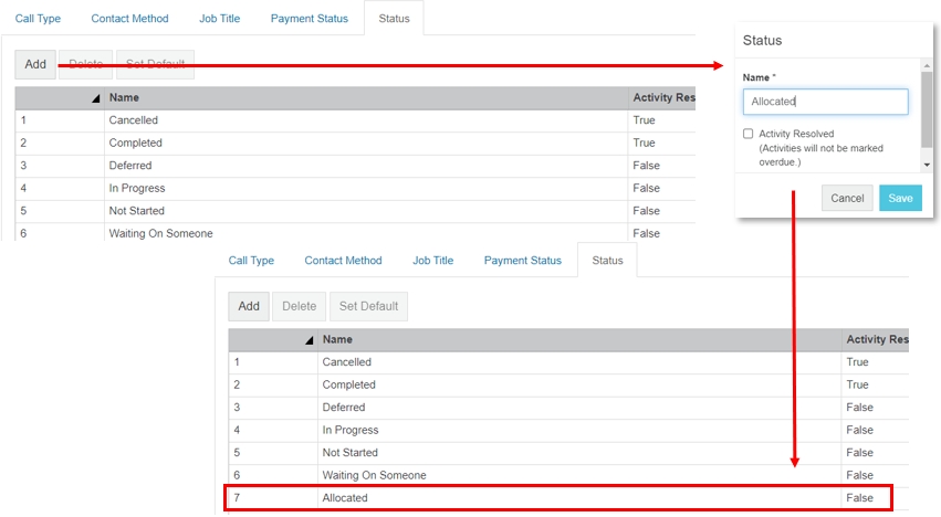 On the Picklists page, click the required tab (Call Type, Contact Method, Job Title, Payment Status and Status) then proceed as required: