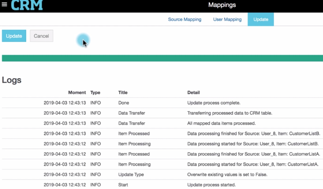 The Update tab only becomes available after you map the data and click Save on the Source Mapping tab. The update action works like a database build in Phocas, in that it brings in updated data. An update cannot be undone.