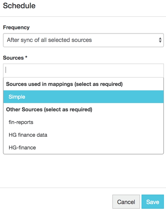 Schedule an update after sync of selected sources: Select the After sync of selected sources option, then select the required sources.