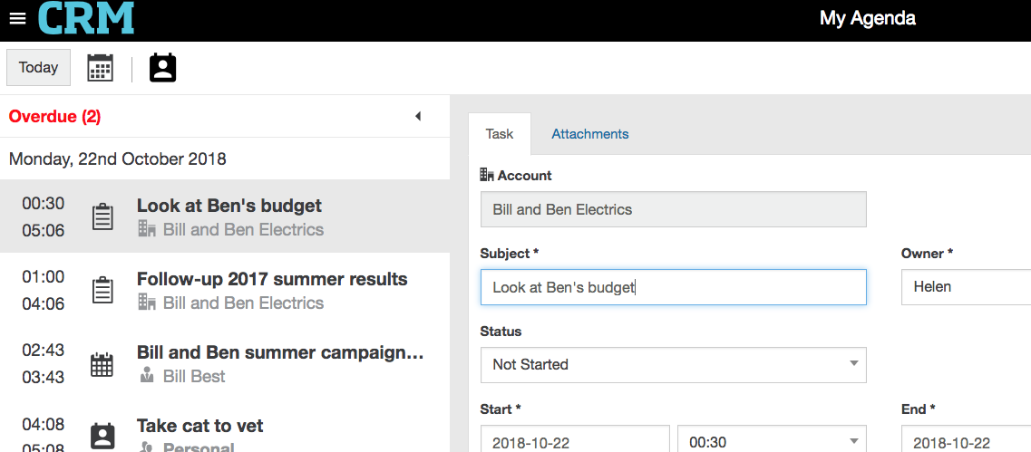 Select the CRM menu button, and then My Agenda. My Agenda opens by default on today’s date and displays list of activities you have coming up for the next week, listed by date.