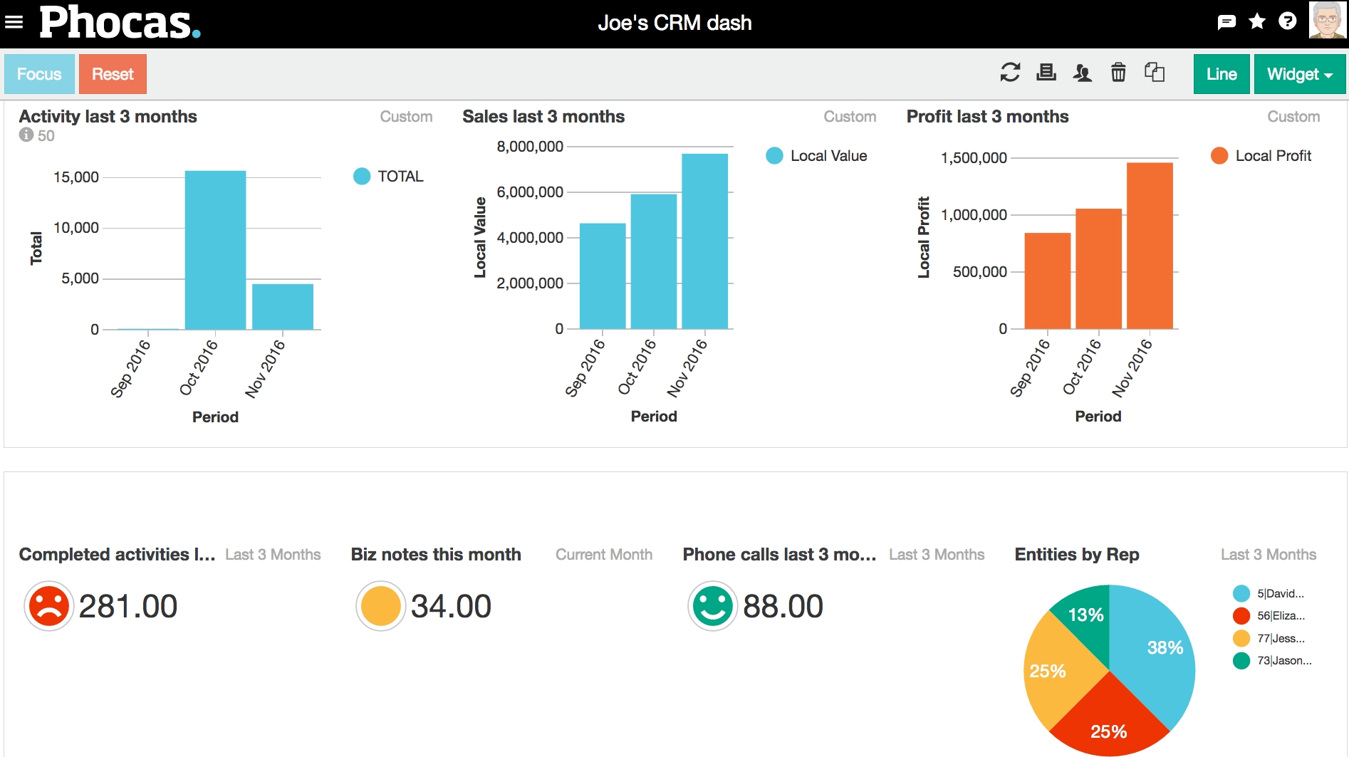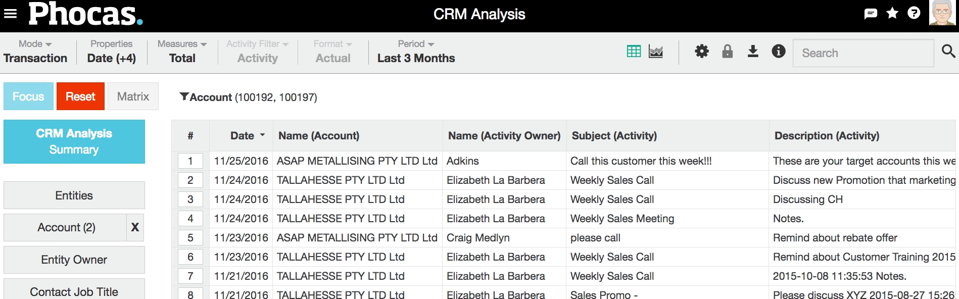 A standard CRM analysis database is similar to any other database in Phocas, but instead of seeing value, profit or quantities, you see the number of activities for accounts, contacts and leads.