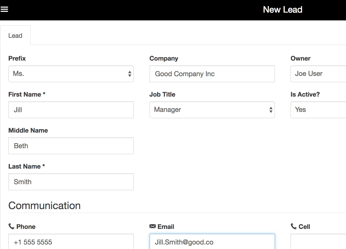Lead tab: View and edit the lead’s details, such as its name, owner, and address, and assign the lead to another owner (CRM user responsible for communicating with that lead).