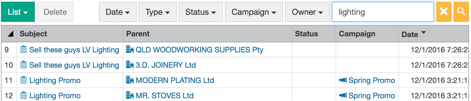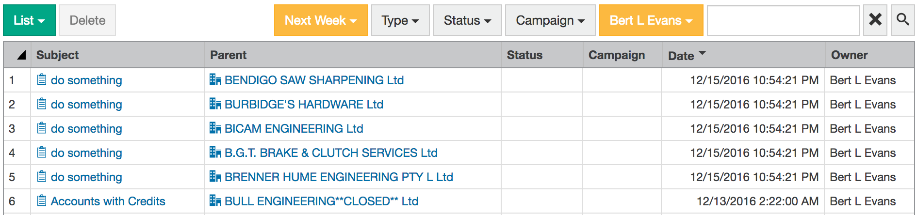 Filter: Use the filters above the grid to narrow your results. The filter button turns orange (and displays your selection) to let you know the filter is active. The types of filters you can apply vary depending on which section of CRM you are in. You can apply multiple filters at the same time. In the following example, the Activities screen is filtered by Next week and the user Bert.