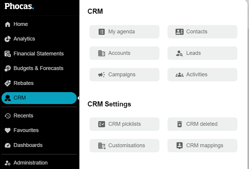 In the Phocas menu, select CRM, then select the CRM item you want to open:
