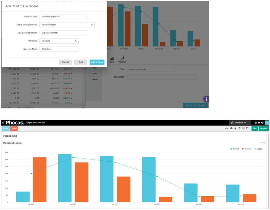 Click Add and Open if you want to add the widget to the dashboard and open the dashboard. This option is useful when you are ready to see what the chart looks like as a widget on the dashboard.