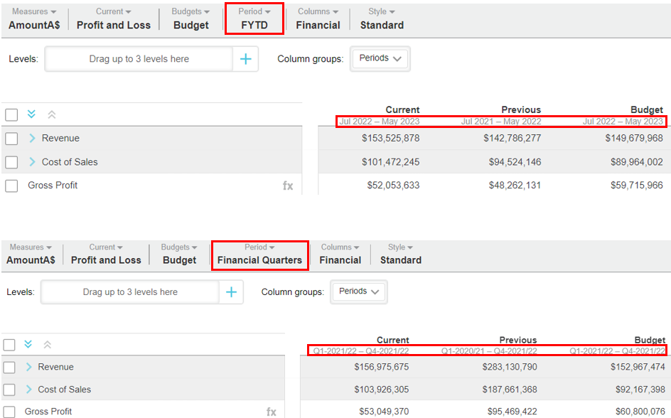Compare the examples in the images below; in the first example, the Financial Year To Date (FYTD) period is applied and in the second, the Financial Quarter period is applied.