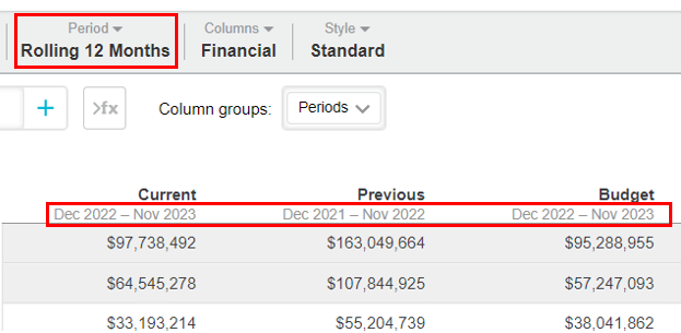 The date range always displays under the Current, Previous and Budget column headers. If you have applied a custom period, the date range also displays in the status bar above the grid.