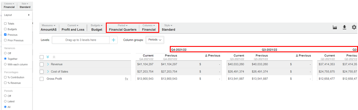 Continuing with the example in the second image above, click the Columns menu, then clear the Totals and Budgets checkbox and select the All checkbox in the Periods section. The statement grid updates to give you a quarter-on-quarter view of performance.