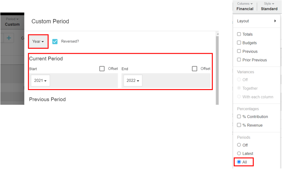 In the Custom Period window, select Year from the top menu (rather than months or any other pre-set period length) and select the total current period range. Then click Columns and select the Periods > All checkbox to display all years in the grid. If you want comparatives, select the Budgets and Prior Period checkboxes.