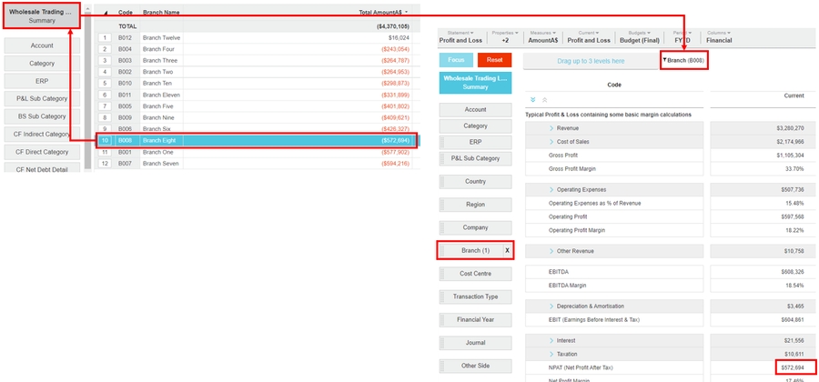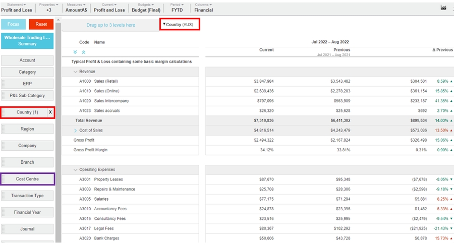 Click the dimension you want to use as a filter, such as Country, Branch, Department, and so on. You move into the Analytics module, where you'll notice some of the menu items change and the Summary button turns grey. The Analytics grid displays a summary performance of each entity in the selected dimension.