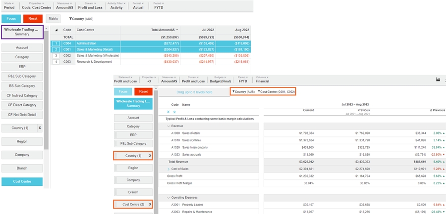 To get a better view of the financial statement grid and see more columns without having to scroll across, you can hide the dimension panel which includes the Summary, Focus, and Reset buttons. This is particularly useful if you have a small screen.