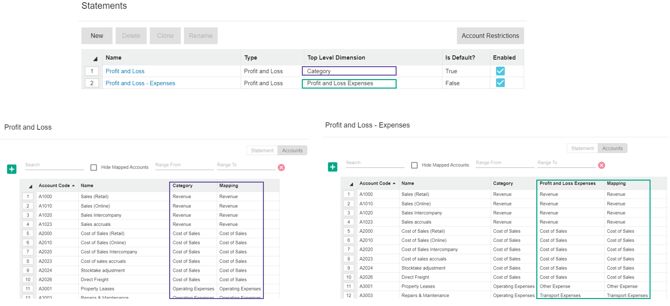 The mapping of accounts links each account in the statement to an account group in the selected top level dimension. This mapping drives where the account appears in the statement.