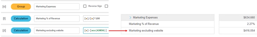 The Account [acc] function references a single account code, allowing you to insert the values of an account, rather than a group, into a financial statement. This function respects the values as displayed on the statement. For example, if the Reverse Sign option is applied to a Revenue group to present values as positive, a referenced Revenue account will also be positive.