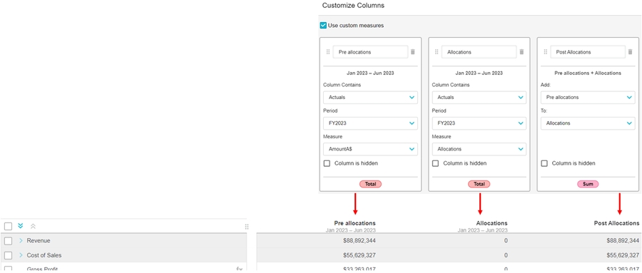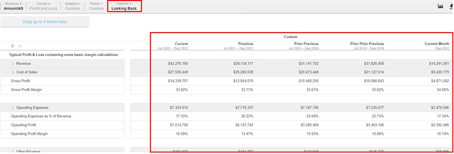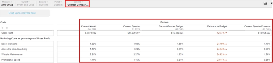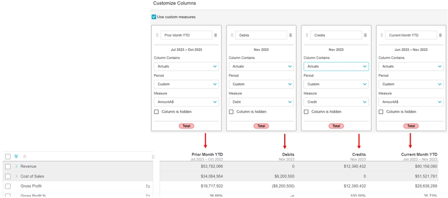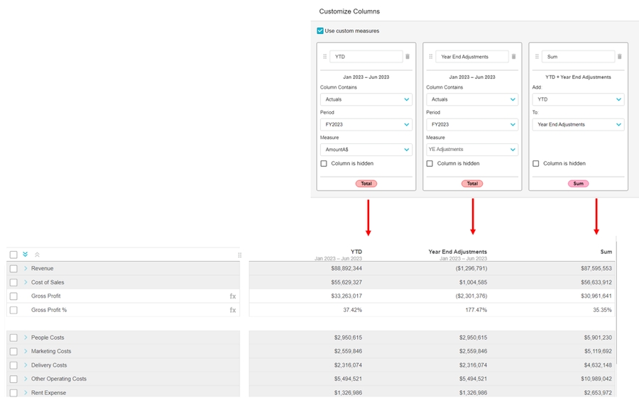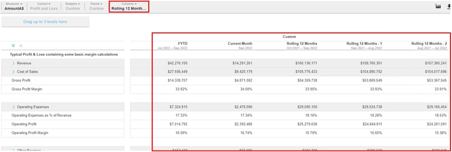 You can design your own version of a Profit and Loss statement and Balance Sheet statement by defining the columns that they contain, giving you much greater flexibility in the layout and analysis capabilities. You can use the custom measures option to insert additional columns into your financial statement, to enable the analysis of multiple measures from the same data stream within the financial statement. You can save your column configurations in the form of layouts, then when you switch to a different version of the Profit and Loss statement, you can apply the saved layout. So you can mix and match your column layouts to have lots of versions of each statement.