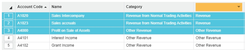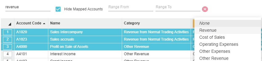 Click the number to the left of an account name to select that account or click and drag down the number column to select multiple accounts. The header on the Mapping column turns orange, indicating that it is active.