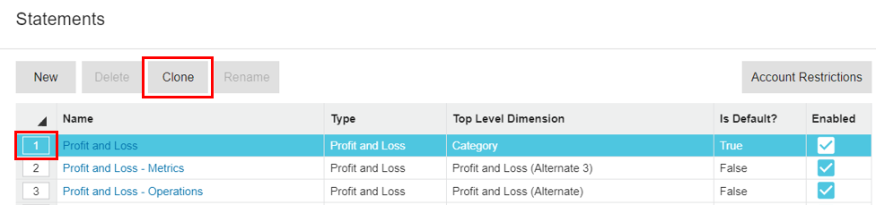 1. In the **Statements** window, select the financial statement you want to clone by clicking the number to the left of its name, then click **Clone**.