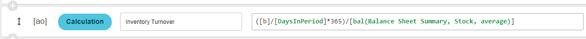 Calculations can also be more complex formulas that include functions, used to calculate financial ratios (such as Days in Period), refer to statistical streams, and include groups from Balance Sheets. The following examples from a Profit and Loss statement show some of these functions.