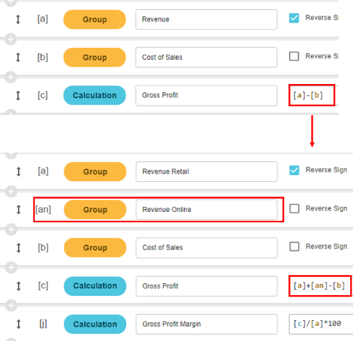 On the Customize groups page there is an example of adding a new group called Revenue Online. As a result of this new group, you need edit the existing Gross Profit calculation to include the new group. Locate the Gross Profit calculation row and edit the formula, as illustrated in the following image.