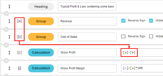 Calculations can be basic formulas that refer to groups or other calculations in the financial statement, identifiable by the square brackets around them, as illustrated in the image below.