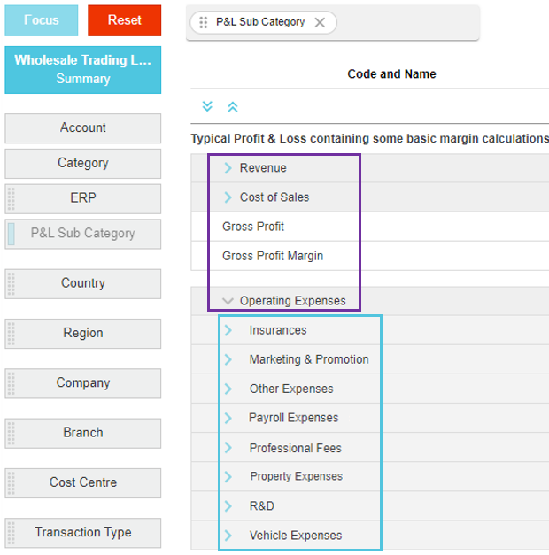 Account groupings within the top-level groups, identified by the blue box in the image below. These groupings display when users add levels (dimensions) to statements to create nested views. In the image below, the account groupings display in alphabetical order, but you might want them to display in a different order.