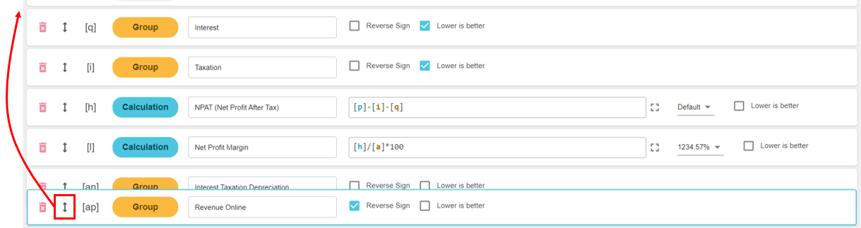 In the statement setup window > Statement tab, click and hold the item’s move button (a blue box displays around the row), then drag the item up or down to its new position.