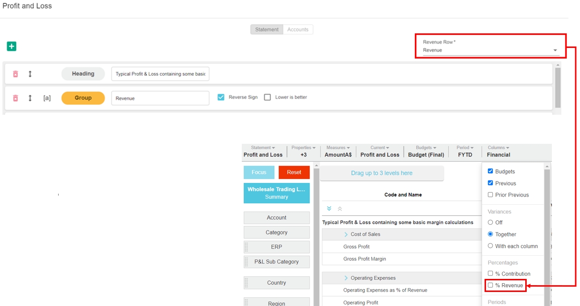 The revenue row is used to drive the % Revenue calculation that you can enable in the Columns menu. Ensure this setting is set to the correct revenue row in your Profit and Loss statement.