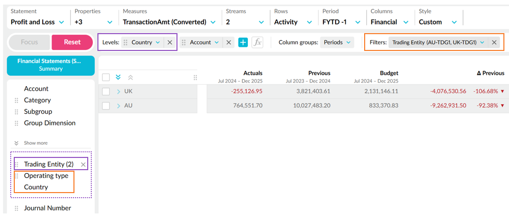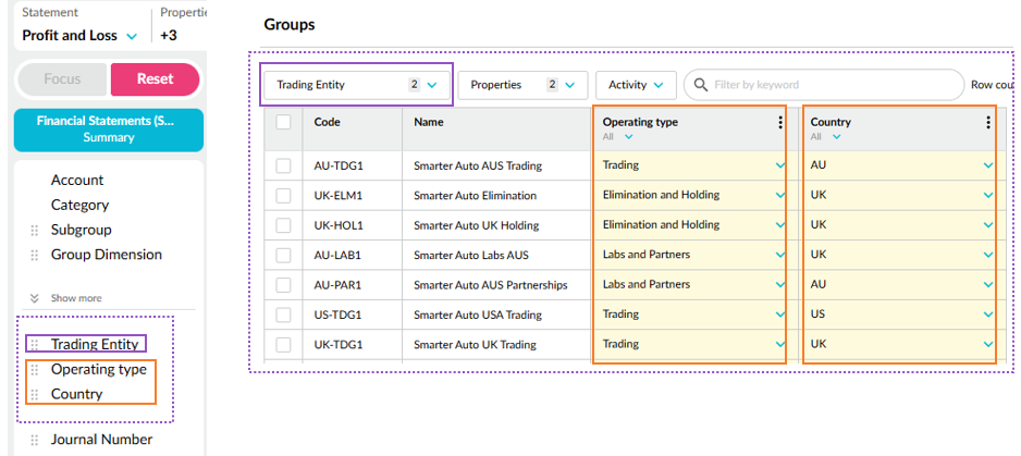 For example, in the image below, the Trading Entity dimension is the primary dimension in a dimension group. It has two sub-dimensions, Operating type and Country.