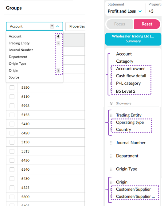 2. Use the **Properties** column to bring in additional information, such as the financial statement category mapping.