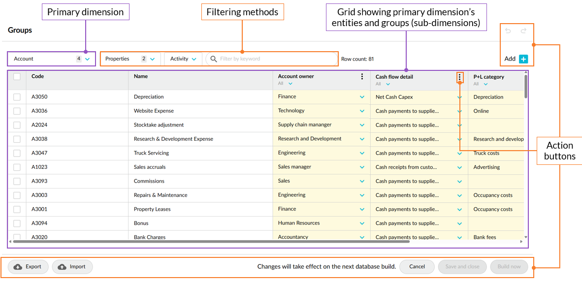 * **Columns**: The properties of the dimension's entities, such as the account **Code** and **Name**, plus any groups (sub-dimensions). The groups provide additional descriptive attributes for each dimension entity. They're another way of grouping the data in the primary dimension.