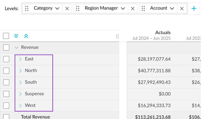 Then, when you add a sub-dimension as a level in the statement grid, its entities display as sub-levels underneath the applicable category rows.