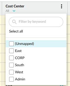 Group entities: The All dropdown button in the header of each group (sub-dimension) column allows you to filter for: