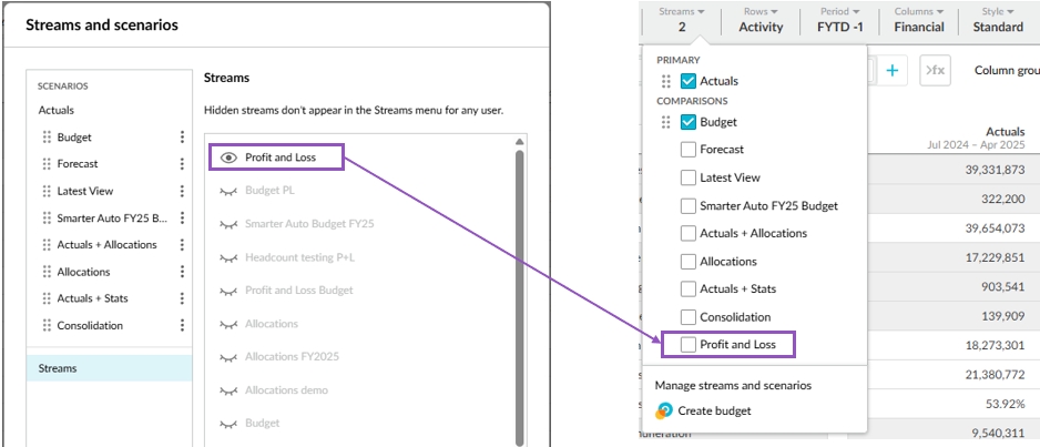 I hid several streams and saw that they were removed from the menu at the time, but afterwards, some of them reappeared. They are still marked as hidden. Why are they visible in the menu? Prior to the release of the Streams and scenarios feature, you had to create scenarios to use a stream in financial statements or custom layouts. Because of that, some extra scenarios might exist with a single stream inside them. This is expected behavior during the transition to the new feature.