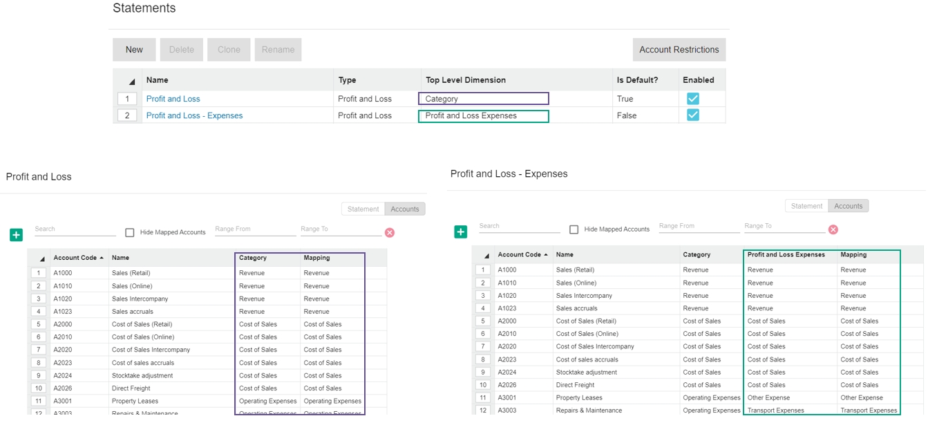 Firstly, your new statement displays in the list in the Statements window, along with the top level dimension you selected. Secondly, when you open the account mapping screen, a new column displays for the new dimension. This is not the case if you selected the Category dimension.