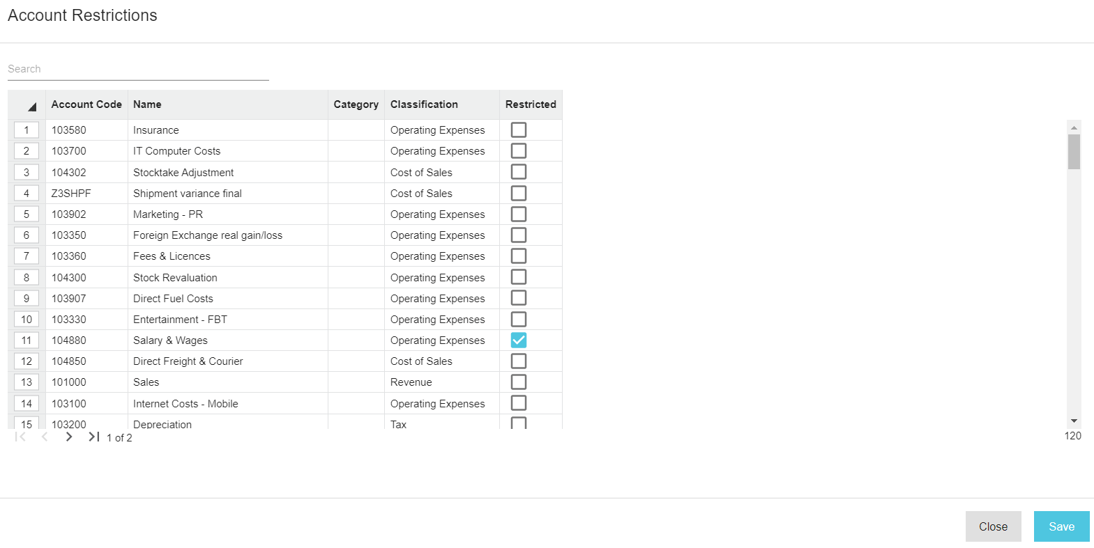 Typically, access to your organization's financial information is controlled by different factors and usually managed by your Administrator. You can also restrict access (for all users) at the account level. For example, if you want to restrict users from accessing sensitive information such as payroll details, you can restrict access to the Salary & Wages account.