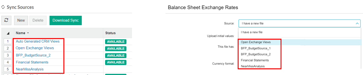 In the Balance Sheet Exchange Rates window, select the required sync source from the Source list. An additional dropdown list of all the exchange rate items in that source displays.