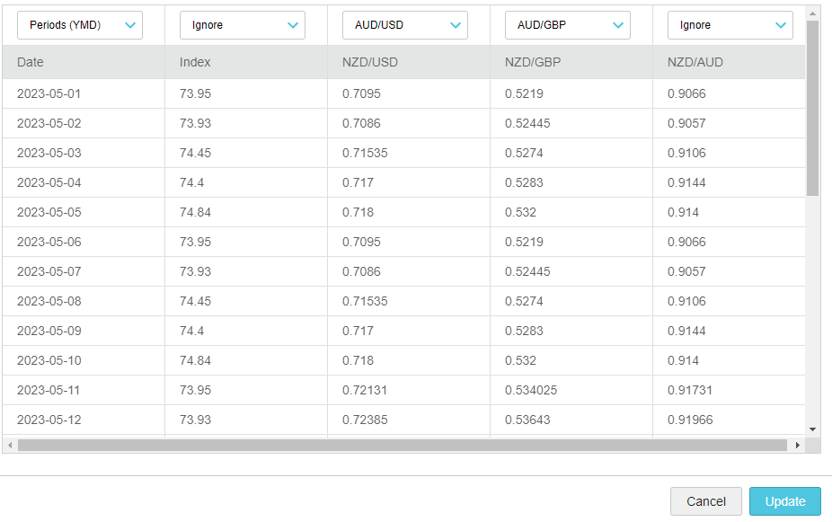 The data is automatically mapped to the items in your multi-currency settings, based on the header and data type of each column in the data item.