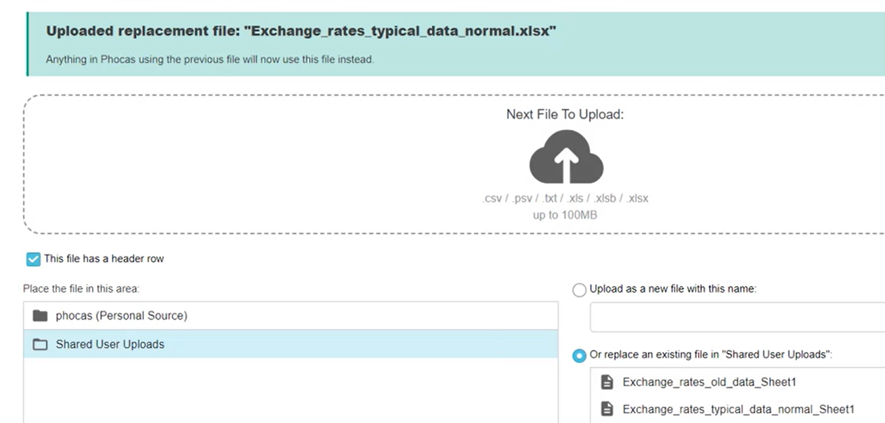 This method adds a new file that contains the exchange rate data as a sync source in your Phocas site. There are two ways to do this. The recommended way is to use the Upload files tool. However, you can also add a file via the Balance Sheet Exchange Rates window, as outlined below.