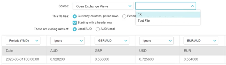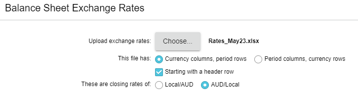 You need to set up a link to the exchange rates you want to use in the Balance Sheet calculations. Typically, you do this every month. A range of file types are supported.