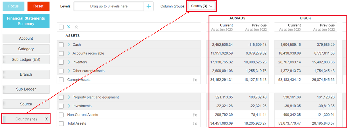 Drag the dimension you used in the multi-currency setup, such as Country, to the Levels box to view the contribution of the individual items (countries) within the overall performance. If there is no translation reserve, it is because the local currency is the reporting currency. See Add a level in a financial statement.