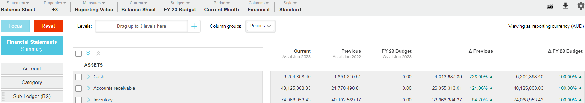 Open the Balance Sheet statement and select the reporting measure from the Measures menu. A message displays in the top right corner of the statement to let you know the reporting currency you are viewing in the statement.