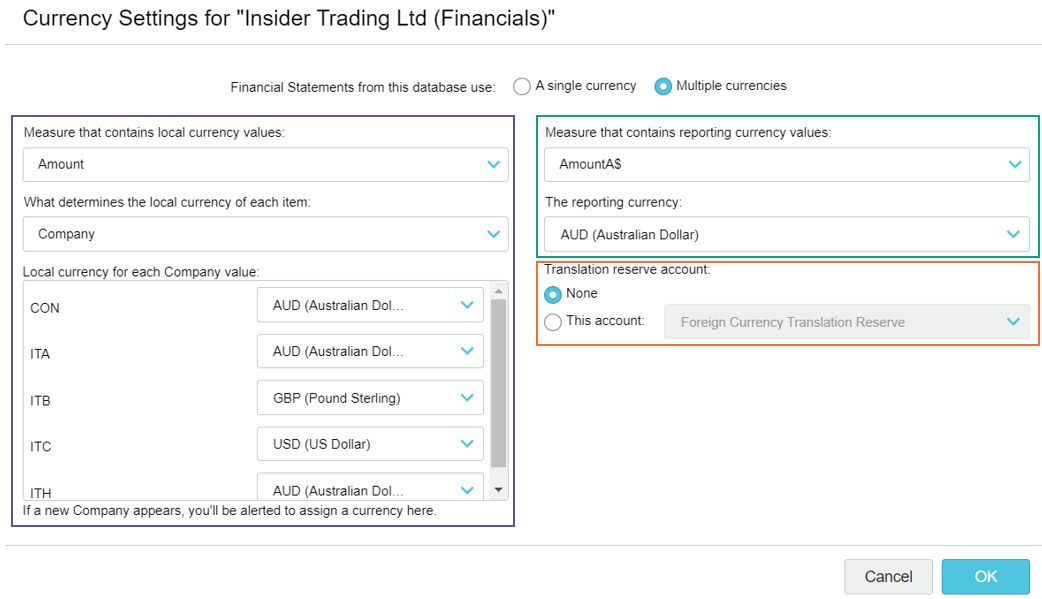 Selected the local currency (such as AUD (Australian Dollar), GBP (Pound Sterling), USD (US Dollar), and so on) for each of the entities in the dimension.