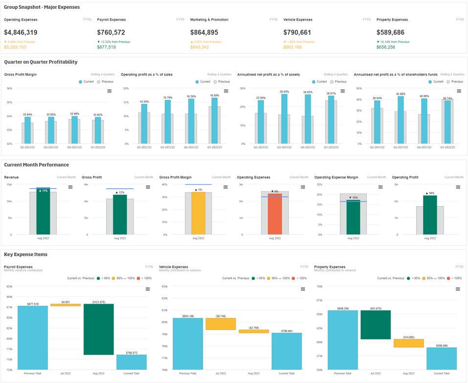 Dashboards provide powerful insights and overviews of your financial information in one place, making it easy to get quick answers and insights, and monitor performance. Dashboards are made up of lines, in which you can have a range of widgets from different financial statements. For example, you can use different widgets to visualize KPIs and financial ratios that are meaningful to a wide range of audiences. You can also include non-financial metrics to provide context to your financial data and enable a greater understanding.