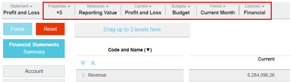 Switch between your Profit and Loss, Balance Sheet, Cash flow, Trial Balance, and other custom financial statements in the database. The statement you select is displayed in the grid. This menu also includes quick links to Phocas Analytics modes, if applicable.