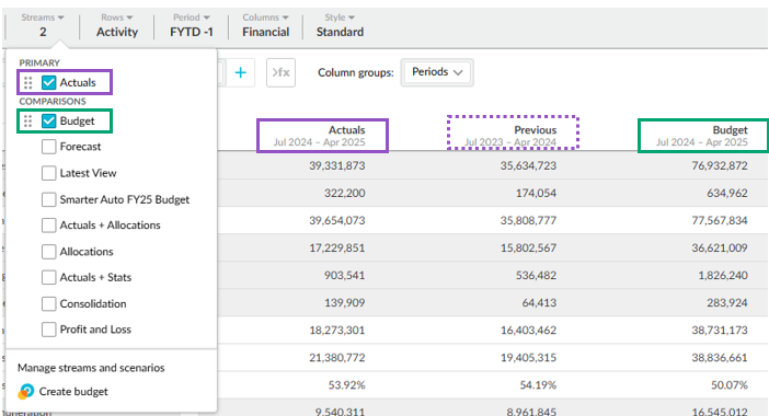 The Streams menu determines the data (streams and scenarios) that’s displayed in the financial statement.