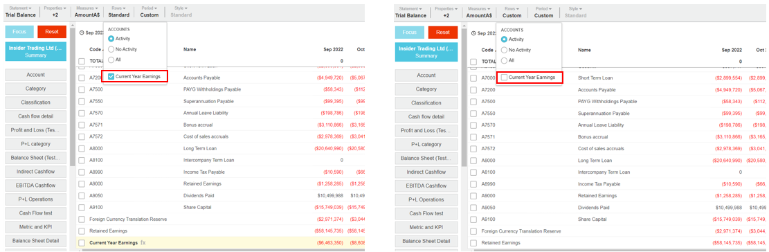 The Rows menu allows you to show or hide the items with activity, determining which rows are displayed in the financial statement and giving you a simple way to identify active or inactive items. In a Trial Balance statement, you can also show or hide the Current Year Earnings row.